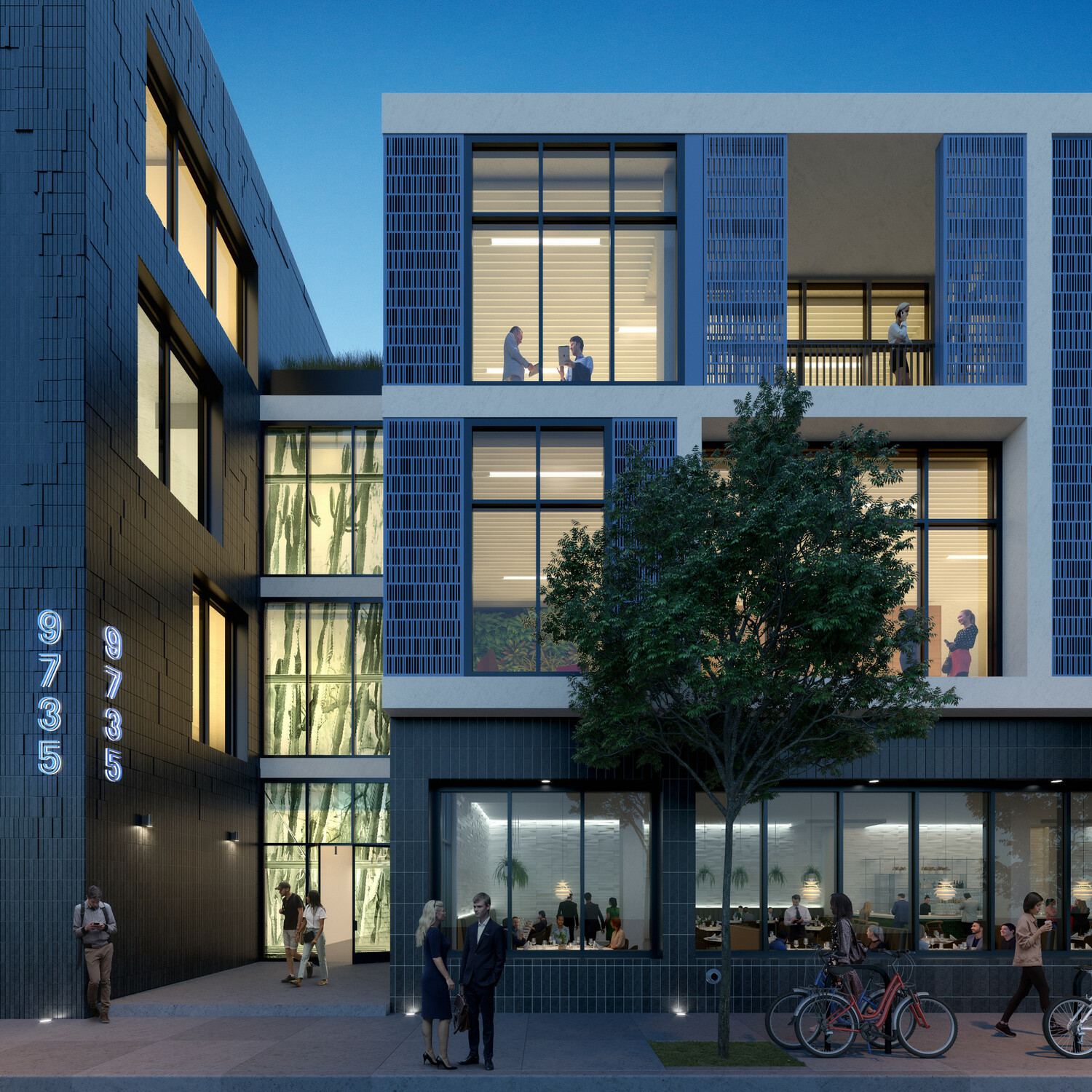 The Brick pays homage to the surrounding historic core, essentially a contemporary interpretation of the historic landmarks in the Culver City area. Bricks are used as an ornamental tile and again to create a 3D pattern that emulates ivy growth and provides variation and shadow play. This textured half of the project features a dynamic shift between large, building-scale window openings to a finely hewn, human-scale materiality. The Machine features a series of small-scale exterior balconies equipped with operable full-height screens made from perforated aluminum. The punched metal panels offer visual privacy for the inset balconies while also providing cross ventilation through the building and into the central courtyard. The large, rolling metal panels span both the facade of the building and the open-air balconies, allowing their daily movements to add to the vitality of Downtown Culver City.