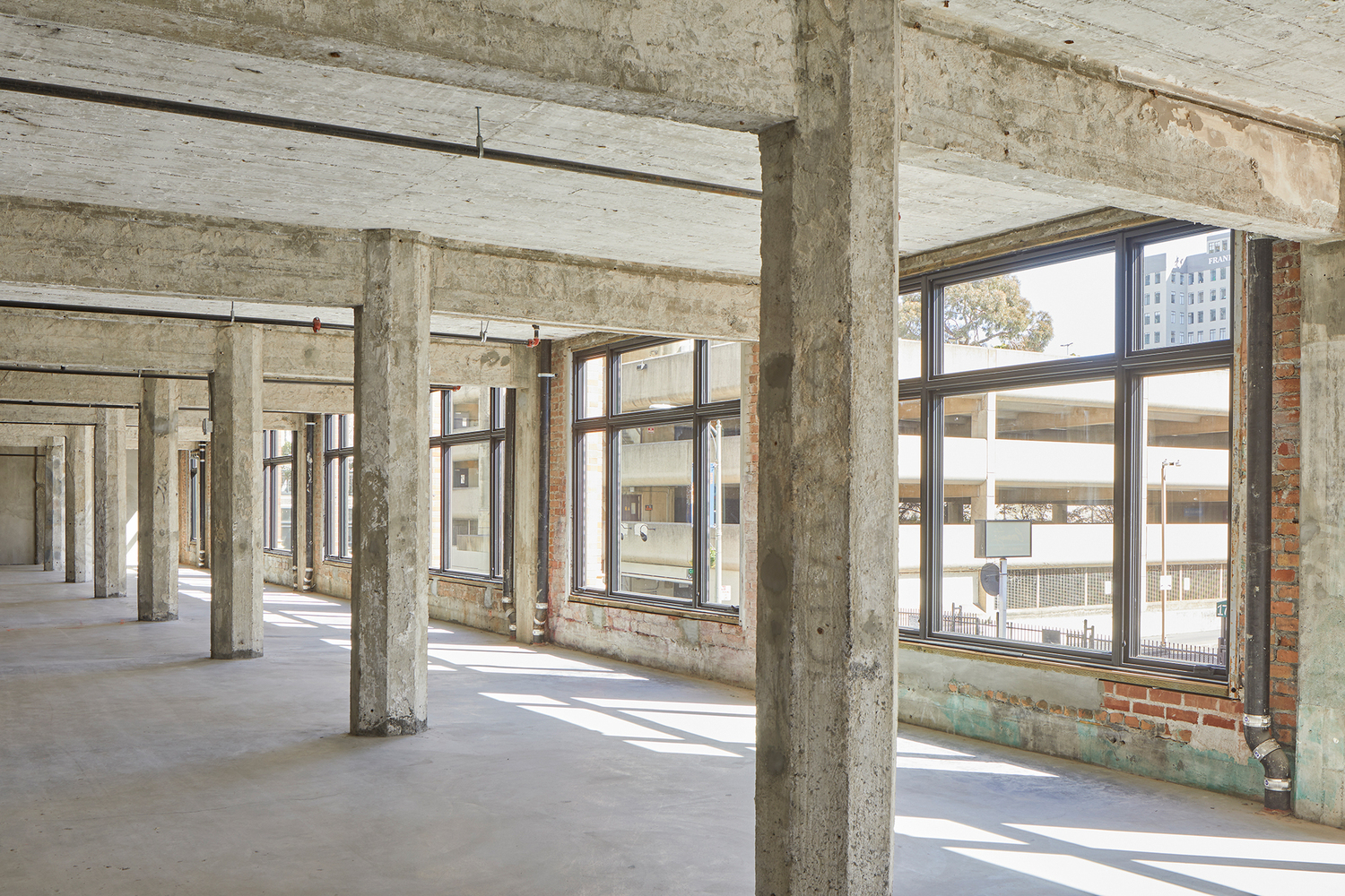 Non-historic interior partitions and ceilings were removed to create an open canvas for incoming tenants.