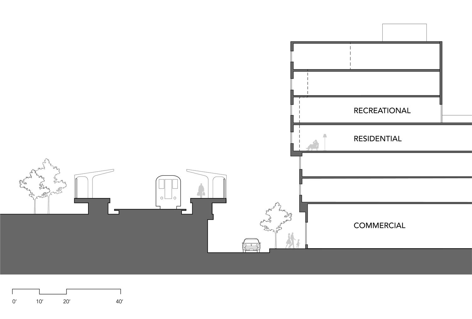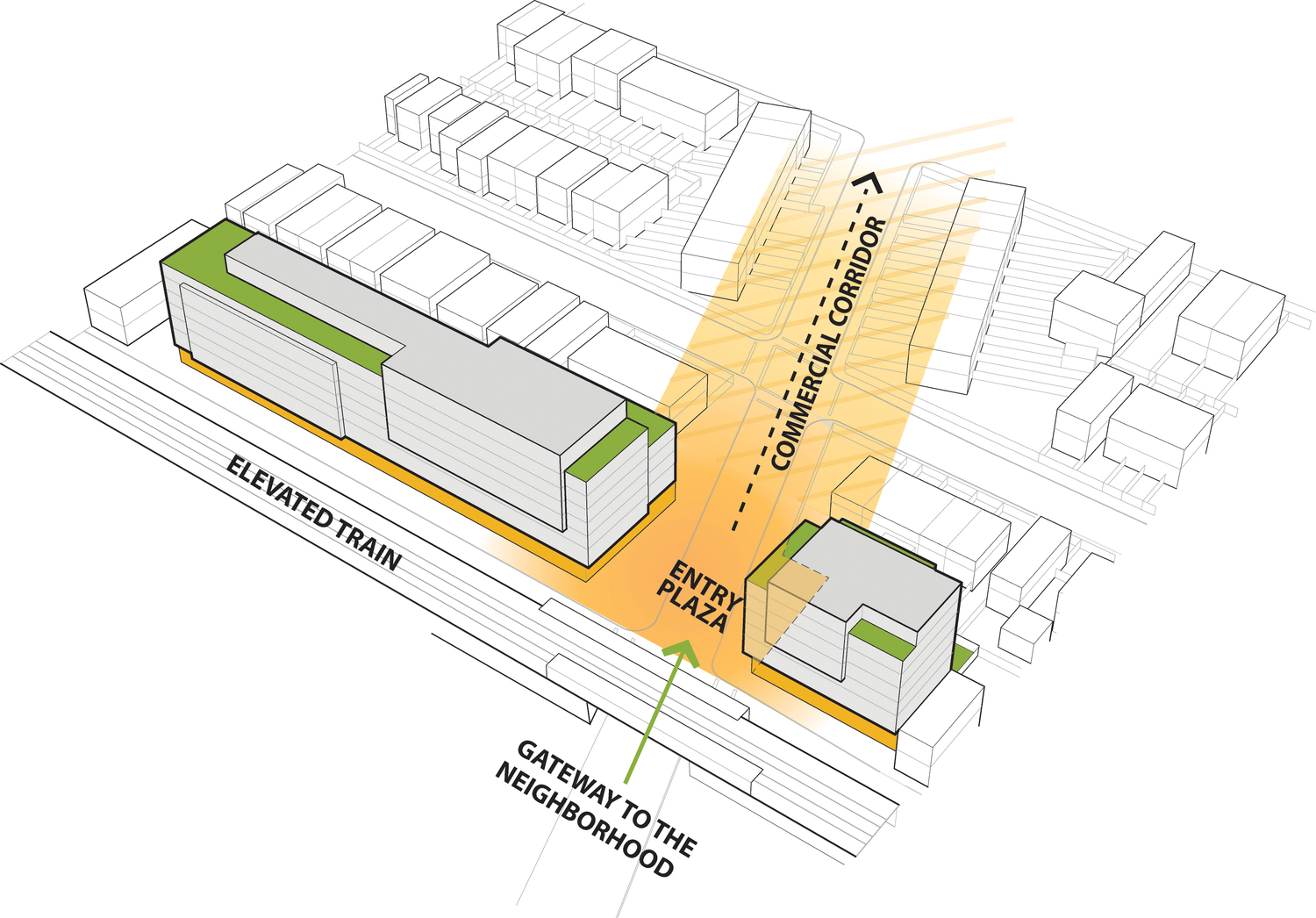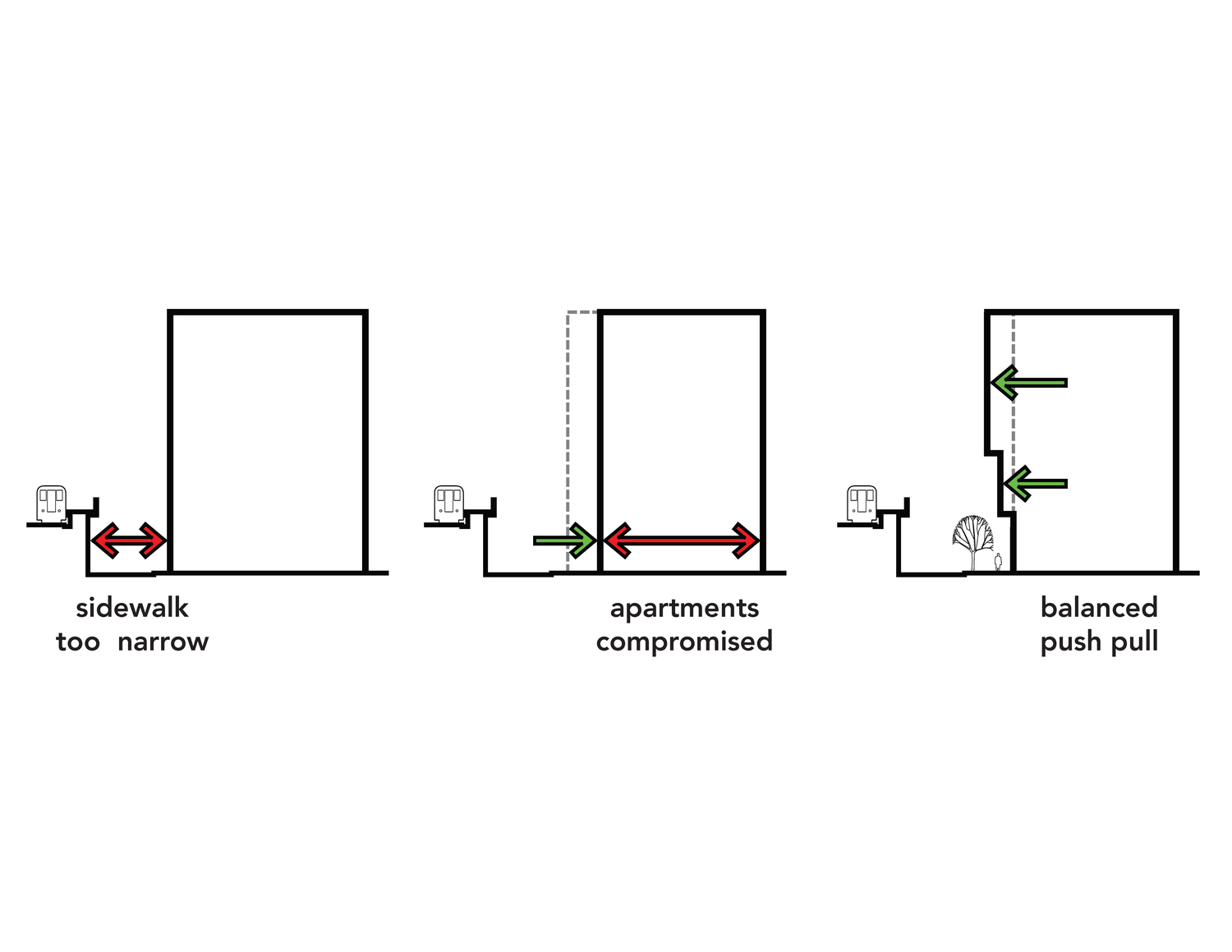The long linear site, fronting the elevated train tracks on a 26-foot narrow street, had a very narrow 5-foot sidewalk. The design sets back the ground floor building massing to provide a generous 15-foot-wide sidewalk for a better and safer pedestrian experience and a stronger presence for retail.
