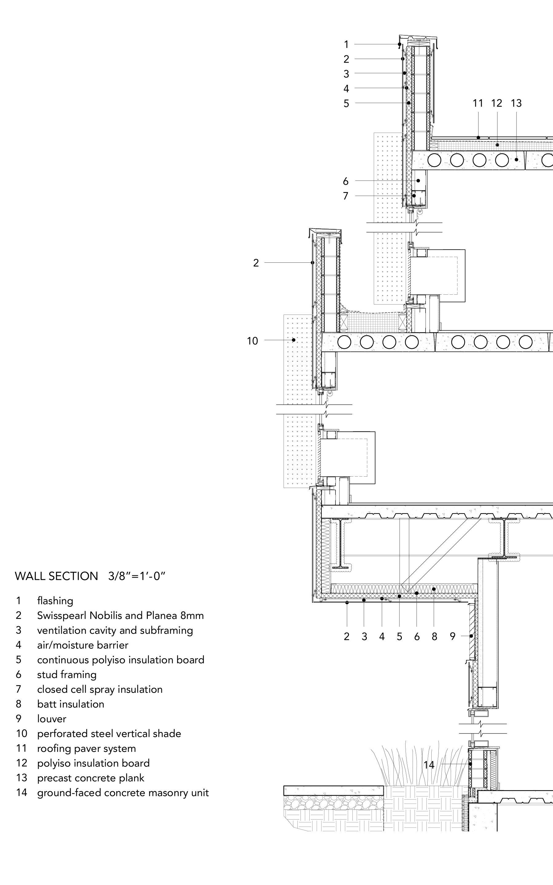 The colorful exterior cladding system is a ventilated rainscreen composed of fiber cement panels and a girt support system. A lightweight insulation board serves as the sheathing, continuous insulation, and air and moisture barrier, all-in-one, reducing labor costs and installation time. Its high compressive strength stabilizes the substructure, allowing attachment with simple channels and long screws to create an inexpensive thermal-bridge-free system. Panels are manufactured using 95% natural raw materials and are fully recyclable. Open joint rainscreens require less sealant, a high embodied energy material.
