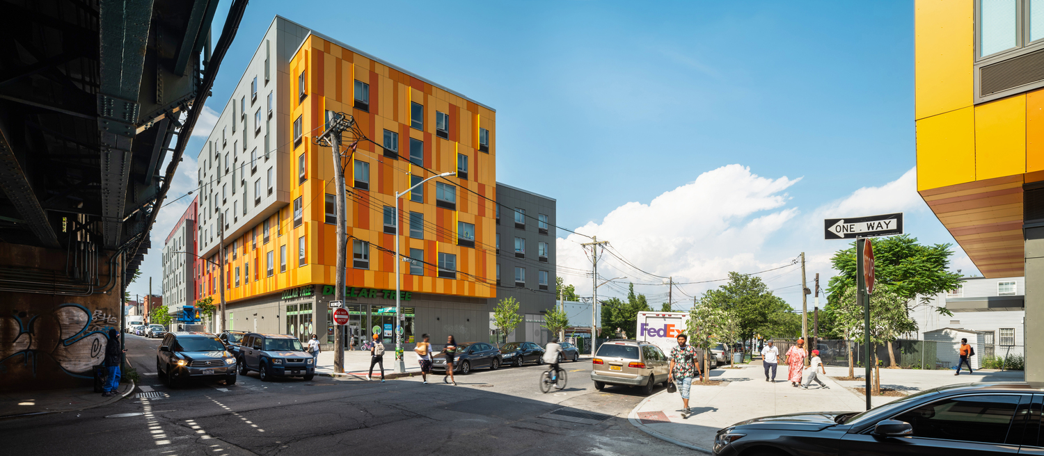 Van Sinderen Plaza runs alongside the elevated tracks of the L train from Manhattan. The design uses a gradation of bold colors down the full length of the façade to amplify the linear movement of the trains coming and going.