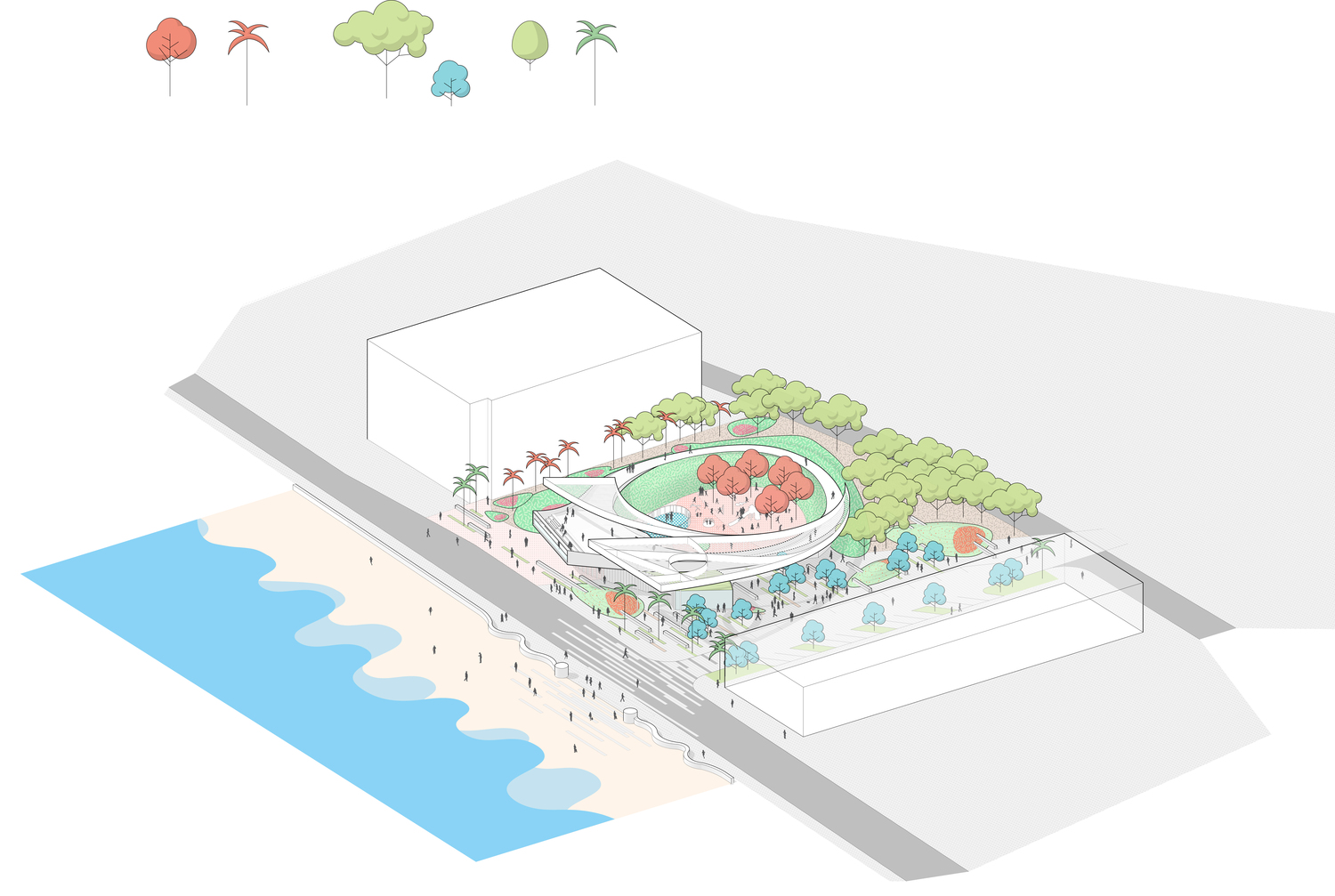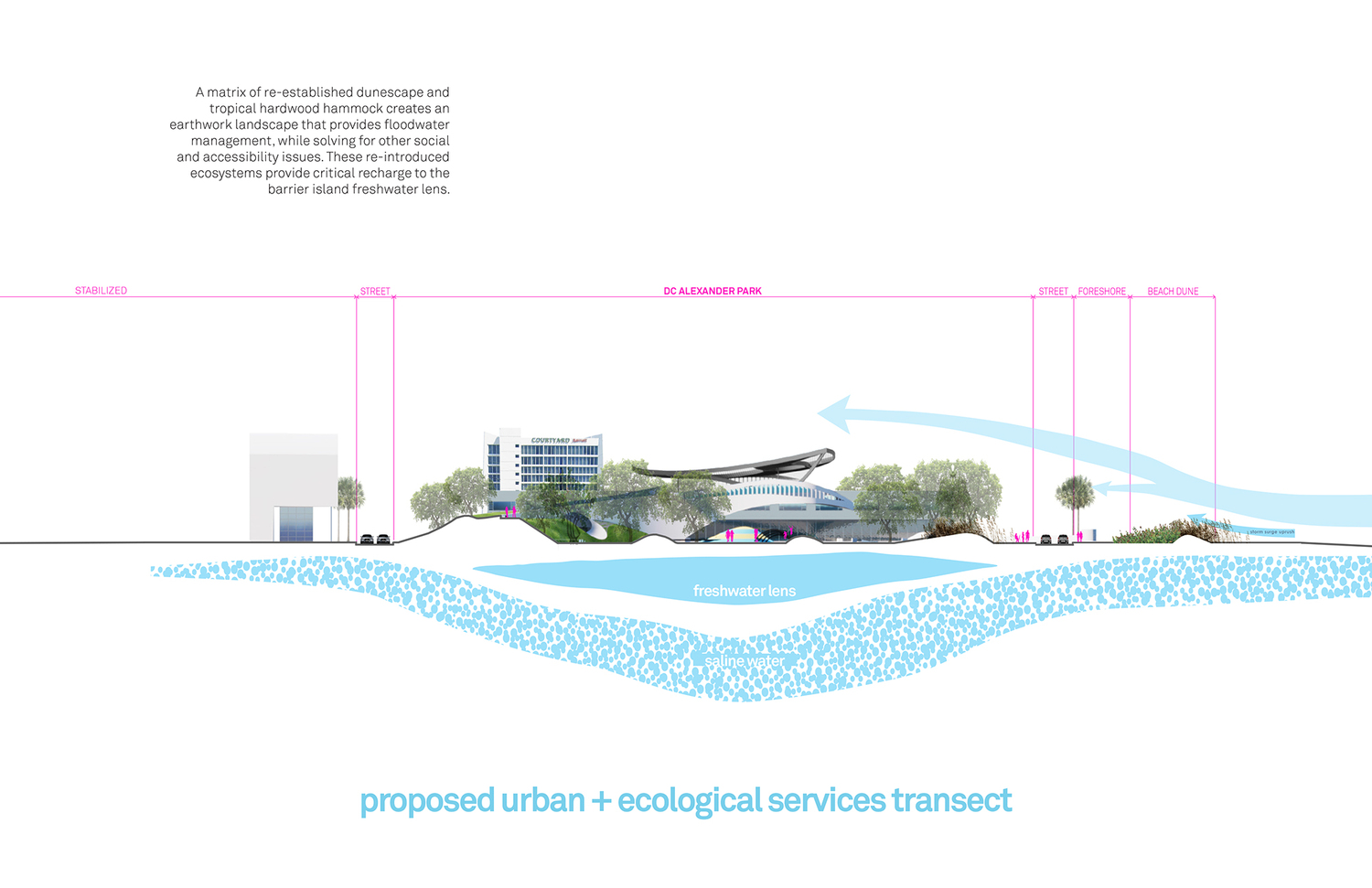 Around its edge, re-established hammocks act as sponges for rainfall and saltwater flooding while establishing native habitat and shaded passive areas. A coastal plaza to the north calms adjacent traffic and creates a "shade hammock" using native species such as Green Buttonwood, Gumbo Limbo, and Seagrape.