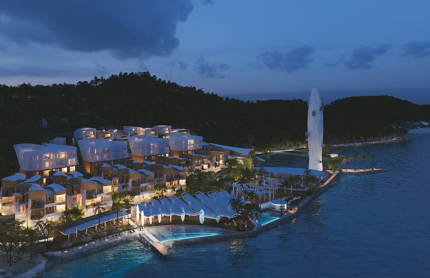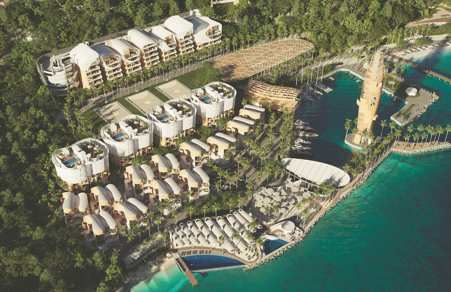 At its heart, Marina Town combines residential villas, garden towers, hillside residences, shops, restaurants, co-working spaces, and a striking yacht club of five pyramidal volumes.