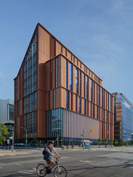 Limberlost Place stands as a new model for sustainable mass timber design and architectural excellence on Toronto's waterfront. Designed by Moriyama Teshima Architects, in collaboration with Acton Ostry Architects, the ten-storey exposed mass timber building is on target to meet LEED Gold and Toronto Green Standard Tier 4, which embodies George Brown College's commitment to innovation, education, and environmental stewardship. The building's expressive roofline and warm, copper-toned facade make it a visible landmark within the evolving East Bayfront district, while its interiors, defined by exposed timber, daylight-filled learning spaces, and naturally ventilated "breathing rooms," create a calm and uplifting environment for study and collaboration.