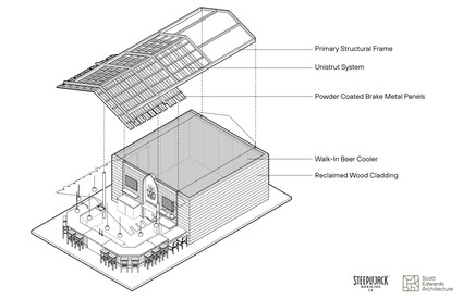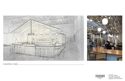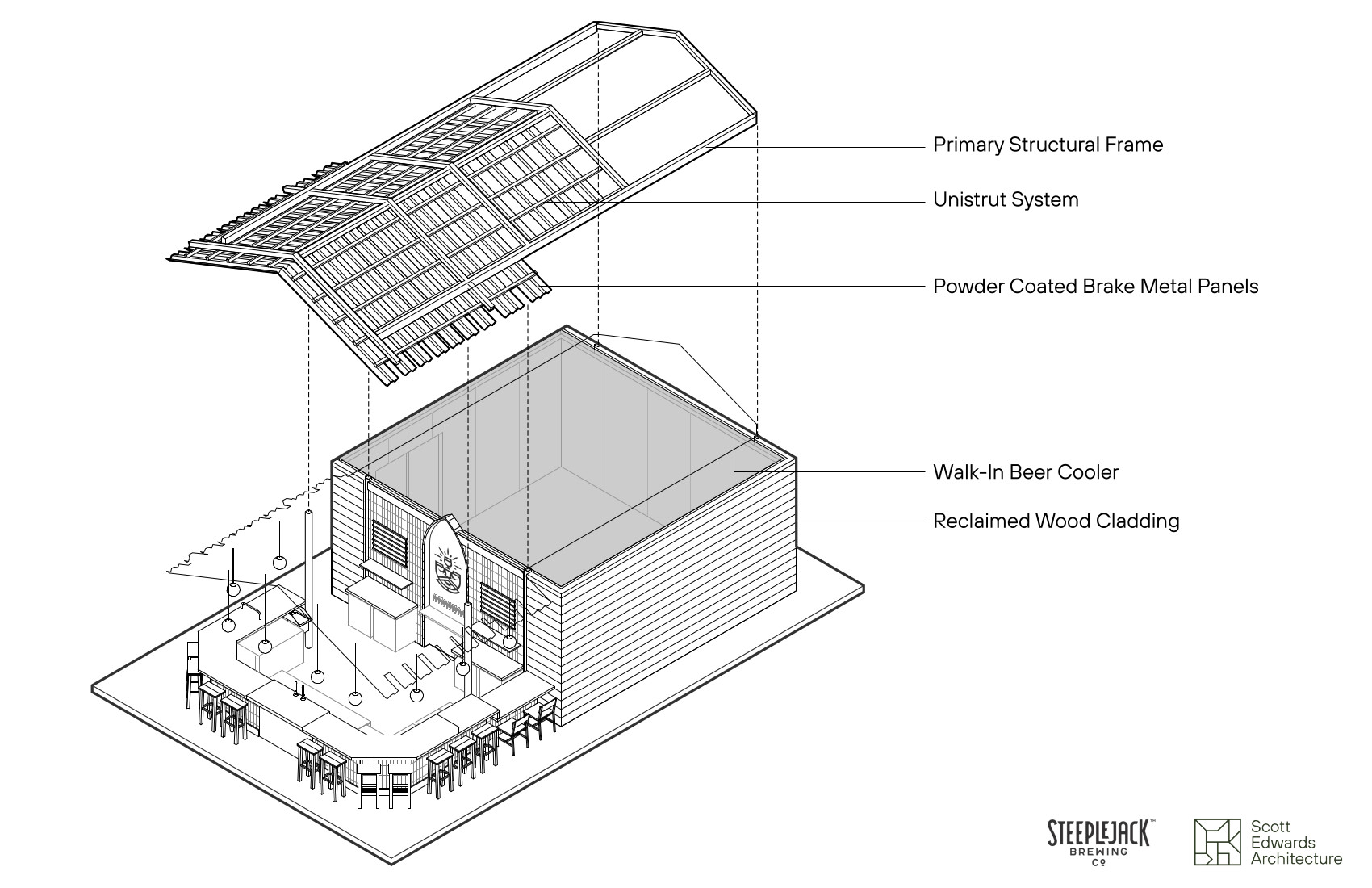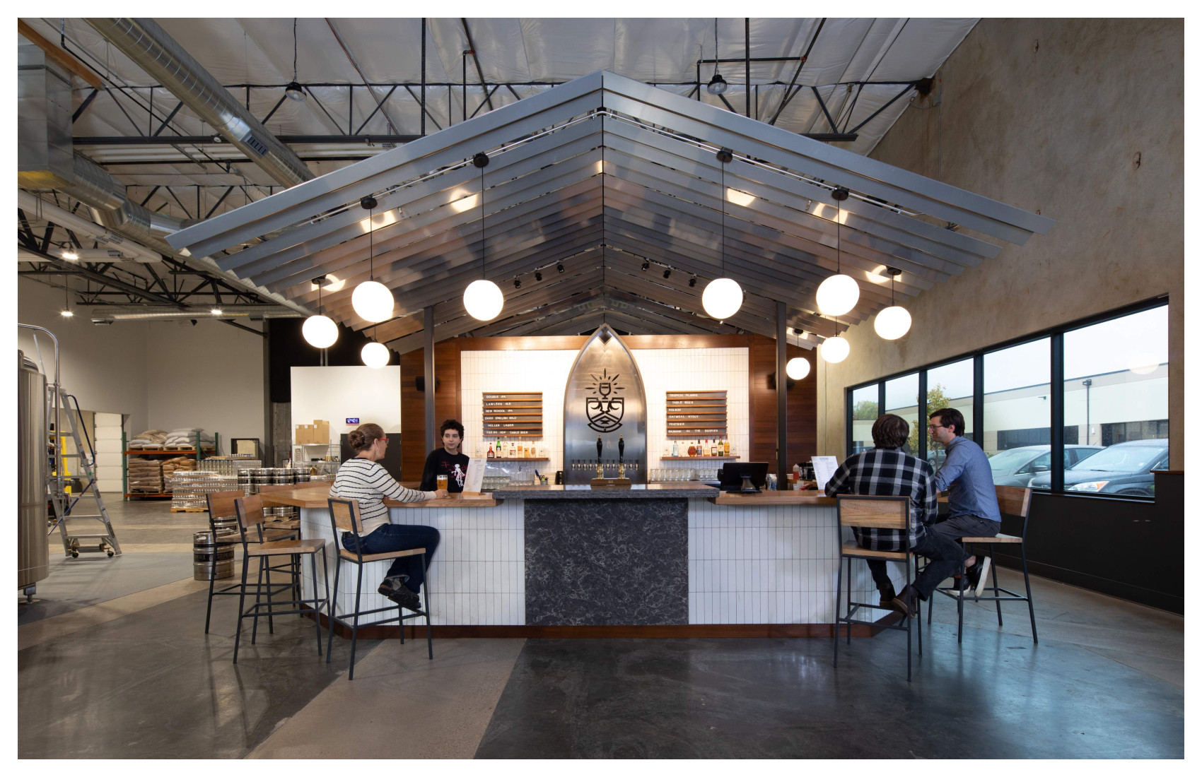 Steeplejack Brewery & Taproom located in Hillsboro, Oregon. Built in a vast industrial warehouse space, the 16,500 sf production brewery and taproom faced the challenge of how to architecturally re-interpret their brand identity and humanize the warehouse scale in a meaningful way.