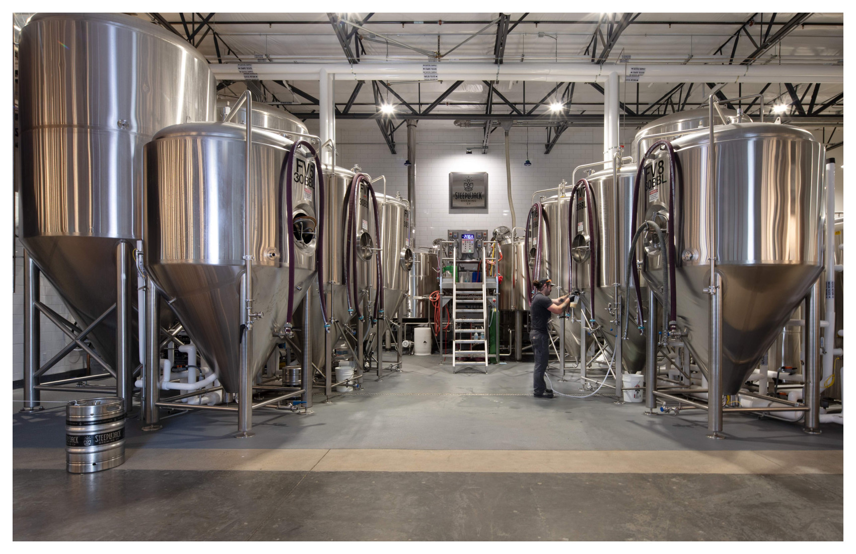 The focal point of the building is the brewery itself, on center stage and axially aligned to the front entry doors, so that when you walk in you feel immediately immersed in the brewery. SEA coordinated closely with the system designers to keep things clean and organized so that the tanks stood out. Larger tanks stack behind the smaller ones, and their placement splays outward toward the entry to create a sense of drama and forced perspective.